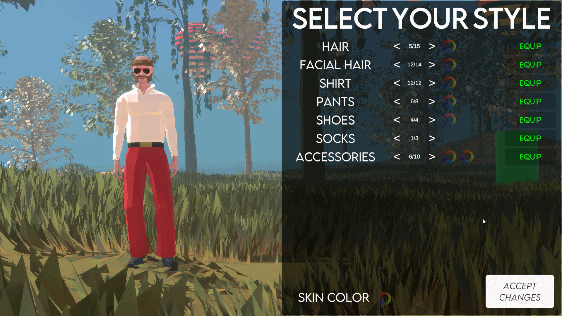 As a Blender exercise (and because I love character creators) I created a range of cosmetic items and a simple menu to equip/recolor them.