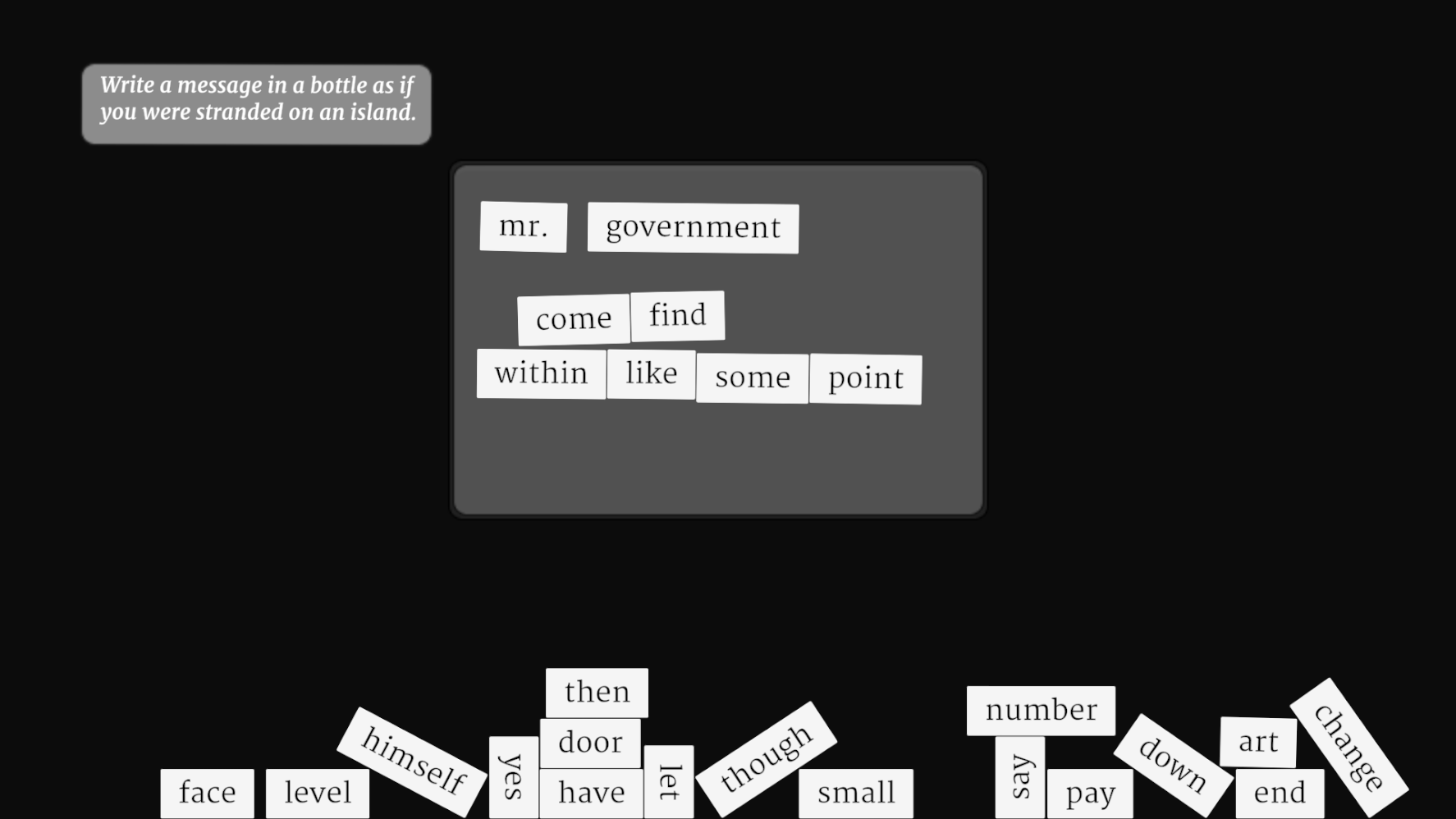 The primary goal of this prototype was to make it feel tactile and satisfying to play. Needing to physically sift through the words you have at your disposal was a key feature, as that is a significant part of the game in real life.